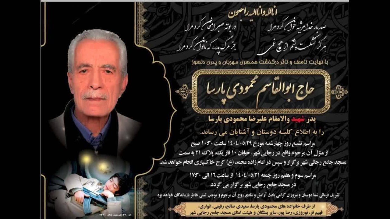یوسفعلی مهرپویا، مدیر امور شعب بانک ملی استان البرز، ضمن عرض تسلیت به خانواده داغدار محمودی پارسا، اظهار کرد: مرحوم حاج ابوالقاسم محمودی پارسا سالها در مجموعه بانک ملی خدمت کرد و با تلاش، صداقت و تعهد مثالزدنی خود، همواره بهعنوان الگویی ارزشمند در میان همکاران شناخته میشد. وی افزود: افتخار بزرگ این خانواده، تربیت فرزند شهیدشان علیرضا محمودی پارسا است که خون پاکش در راه اعتلای اسلام و دفاع از میهن اسلامی ریخته شد.