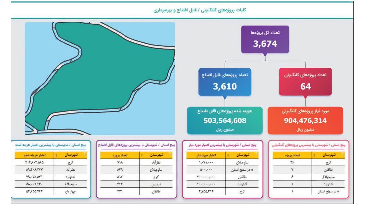 استاندار البرز با اشاره به توزیع شهرستانی پروژههای دهه فجر گفت: بیشترین تعداد پروژههای قابل افتتاح به ترتیب در شهرستانهای نظرآباد با ۹۹۸ پروژه، ساوجبلاغ با ۸۴۹ پروژه، کرج با ۸۱۳ پروژه، فردیس با ۴۲۳ پروژه، طالقان با ۲۷۱ پروژه، اشتهارد با ۱۳۶ پروژه، چهارباغ با ۷۲ پروژه و ۴۸ پروژه نیز در سطح استانی تعریف شدهاند.