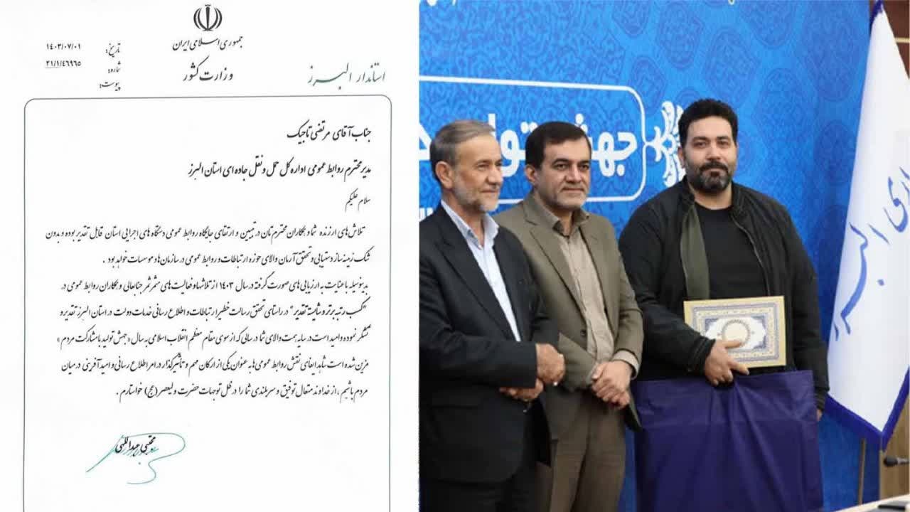 در پایان مراسم، با توجه به ارزیابیهای انجامشده، روابط عمومی این اداره کل توانست رتبه برتر و شایسته تقدیر را در میان دستگاههای اجرایی استان البرز به خود اختصاص دهد.