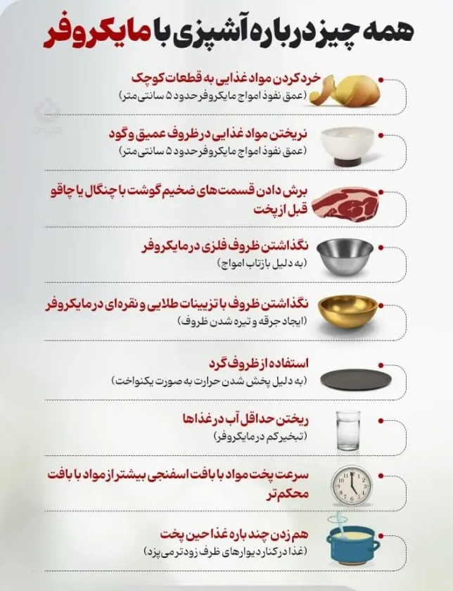 اینفوگرافی؛نکات مهم و ایمنی برای استفاده بهینه از مایکروفر در آشپزییک بنر آموزشی با عنوان «همه چیز درباره آشپزی با مایکروفر» به بررسی نکات کلیدی و ایمنی در استفاده از این وسیله پرکاربرد پرداخته است.