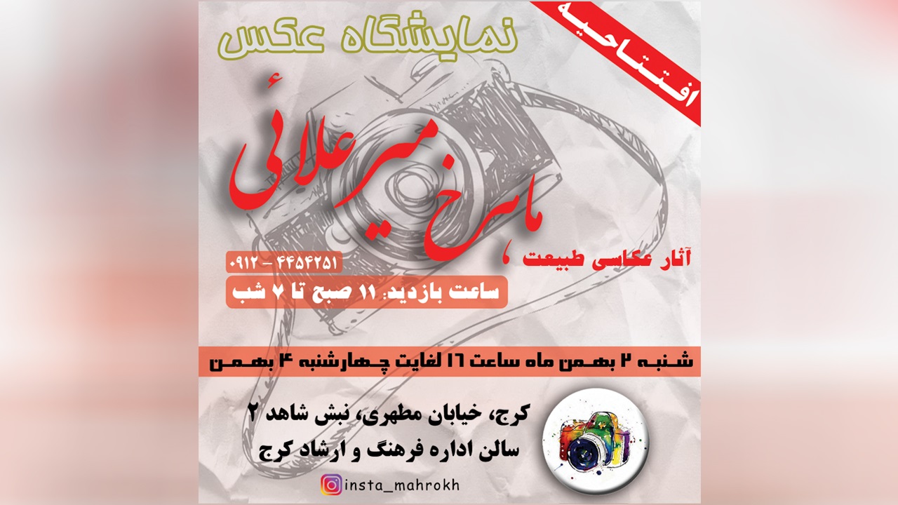 افتتاحیه نمایشگاه عکس آثار عکاسی طبیعت سرکار خانم ماهرخ میر علای؛ شنبه 2 بهمن ماه ساعت 16 در کرج، خیابان مطهری، نبش شاهد 2 سالن اداره فرهنگ و ارشاد کرج افتتاح و چهارشنبه 4 بهمن ماه به پایان میرسد.