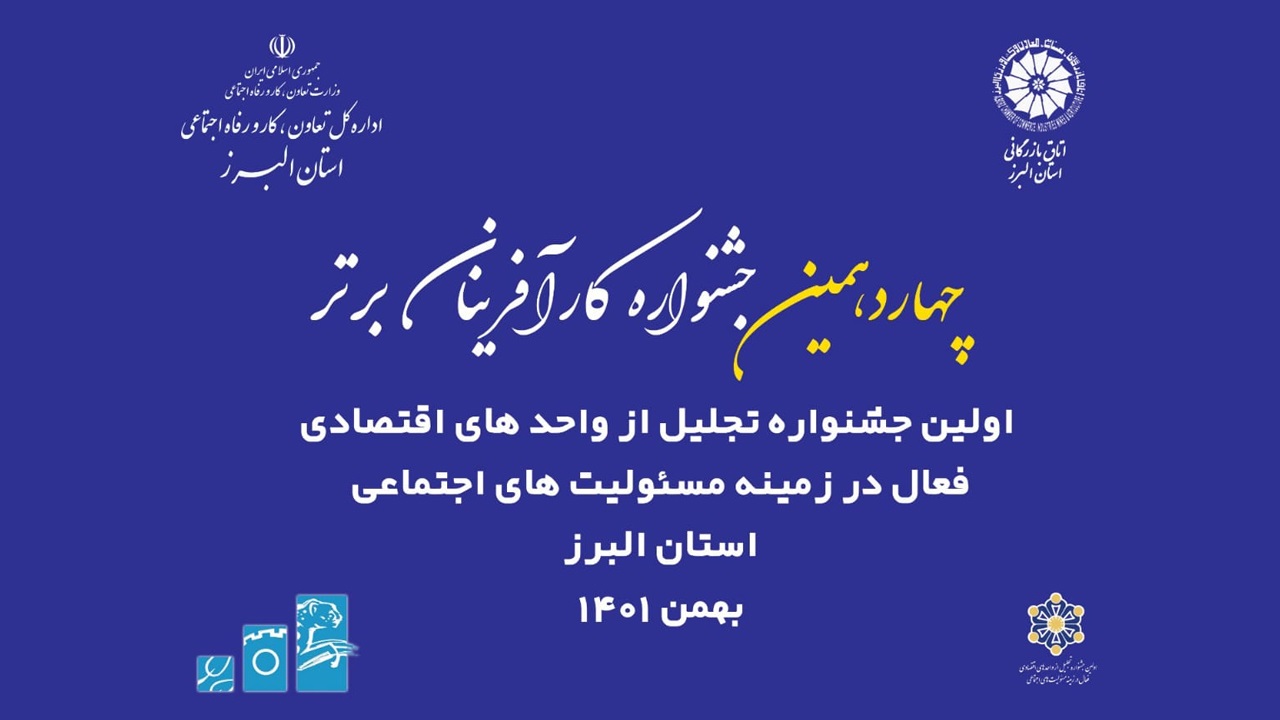 به گزارش روشنای راه، اداره کل تعاون، کار و رفاه اجتماعی استان البزر، با همکاری اتاق بازرگانی ، صنایع ، معادن و کشاورزی استان البرز ، چهاردهمین جشنواره تجلیل از کارآفرینان برتر استان البرز و اولین جلسه شورای سیاستگذاری جشنواره تجلیل از واحد اقتصادی فعال استان در زمینه مسئولیت اجتماعی چهارشنبه 26 بهمن ماه در کرج با حضور معاون وزیر تعاون، کار و رفاه اجتماعی و مدیران و مسولان استانی و مدیران عامل واحدهای اقتصادی و تولیدی و صنعتی برگزار می شود.