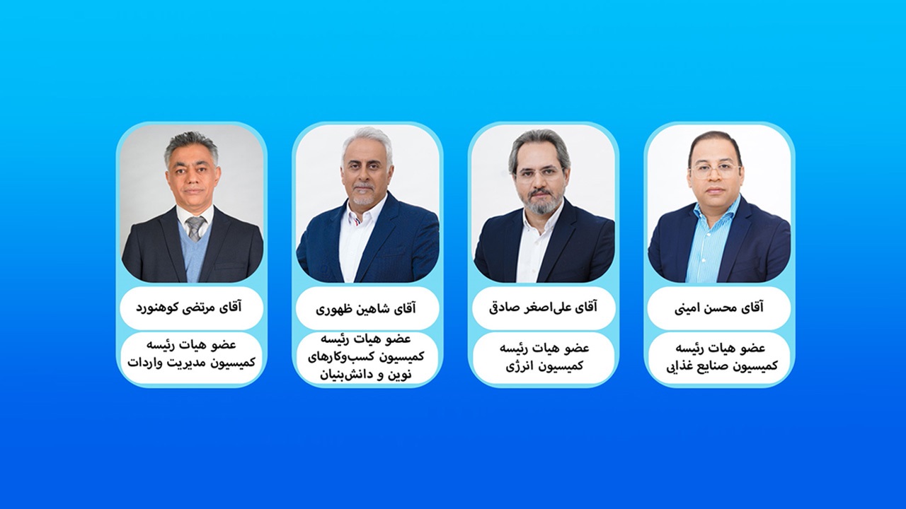 بر اساس نتایج انتخابات هیات رئیسه کمیسیونهای تخصصی اتاق بازرگانی ایران، محسن امینی عضو هیات رئیسه کمیسیون صنایع غذایی، علیاصغر صادقی عضو هیات رئیسه کمیسیون انرژی، شاهین ظهوری عضو هیات رئیسه کمیسیون کسبوکارهای نوین و دانشبنیان و مرتضی کوهنورد عضو هیات رئیسه کمیسیون مدیریت واردات شدند.